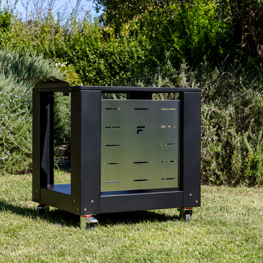 Designed specifically for the all-new Fontana Volta 70 Smart Oven, the Volta 90 Stand provides a stable, practical, and mobile base for modern outdoor cooking. Featuring four heavy-duty castor wheels, including two 360-degree swivel wheels, the stand allows effortless positioning and manoeuvrability. An integrated handle ensures easy movement, while the built-in pizza accessories holder keeps peels and tools neatly stored and always within reach. A clean, functional solution that perfectly complements the Volta 70’s contemporary design and performance.